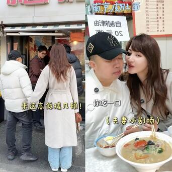 两人直奔街头巷尾逛吃,30元的南京烤鸭,11元的牛肉锅贴,22元的皮肚面……全都你一口我一口地分着吃,杨雪自己都笑说:“不行,(再撒狗粮)一会人家老板该轰我们走了!”转头却又拉着老公猛亲。